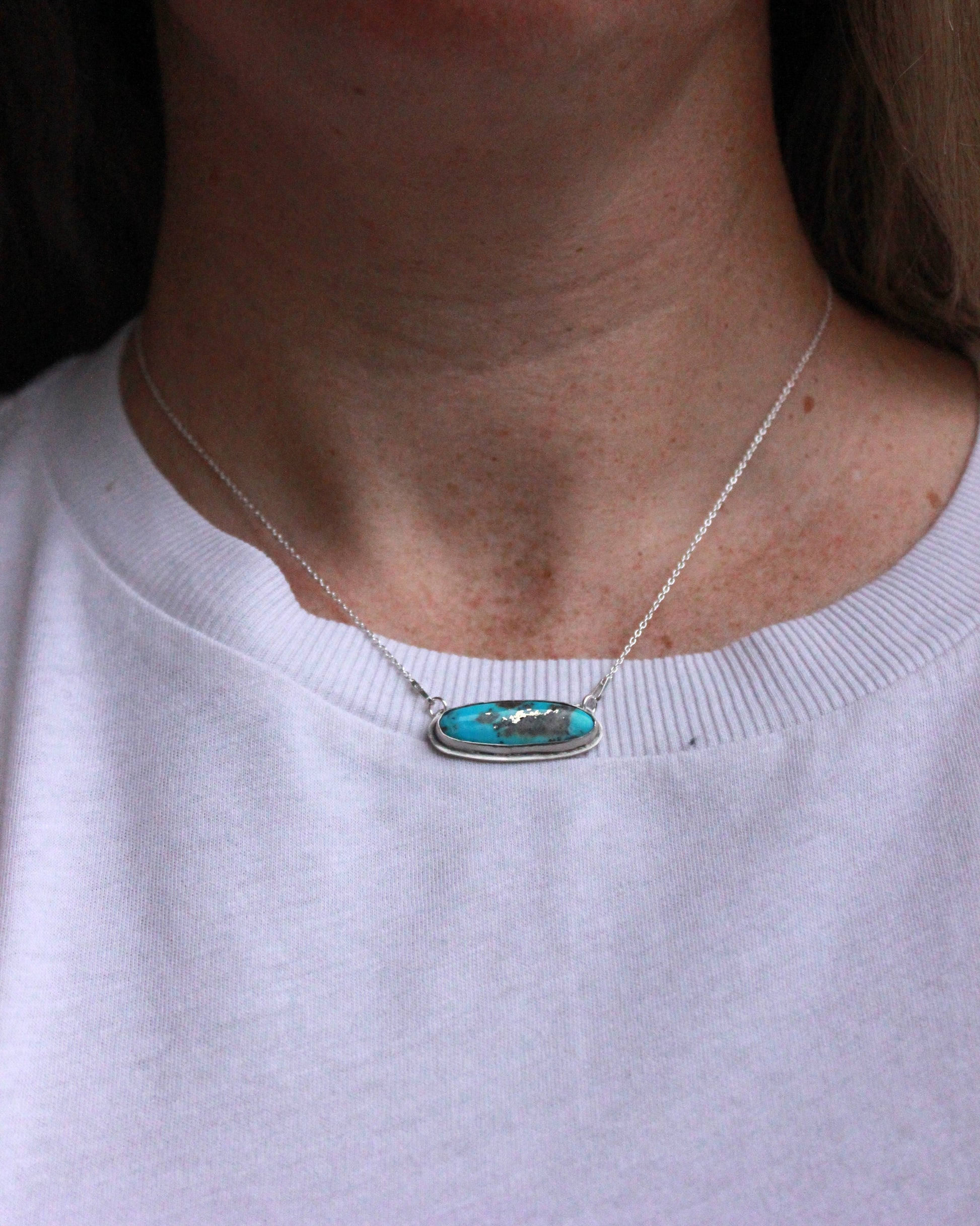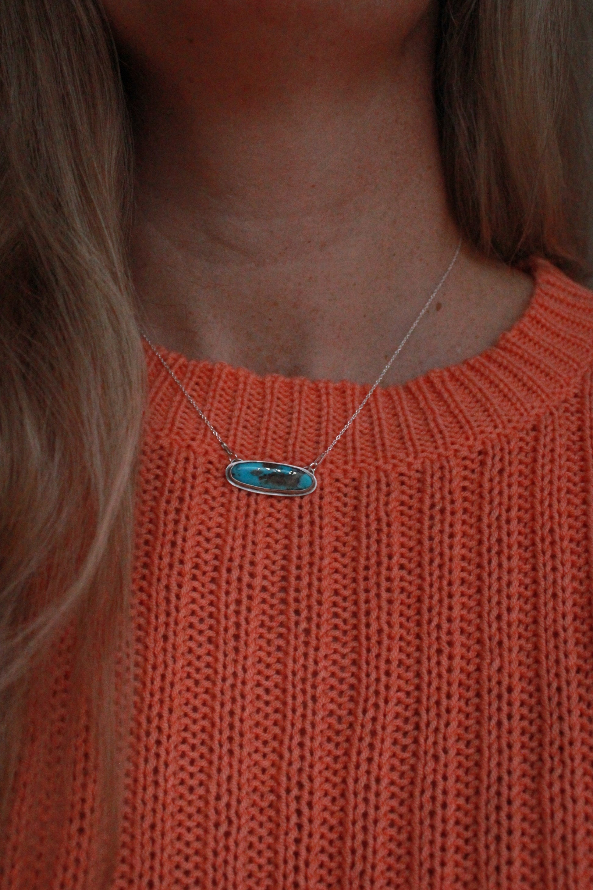 Introducing the Cool As a Cucumber Necklace—a minimalist masterpiece that features a single, exquisite turquoise stone set horizontally on a delicate sterling silver chain. Its simple yet elegant design makes it a versatile accessory...perfect for adding a touch of effortless style to any outfit.