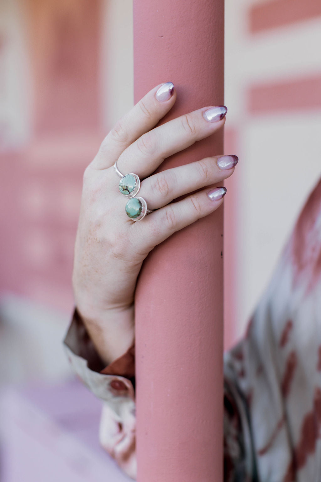 Cozy up in style with the Pumpkin Spice Everythingggg ring, the perfect accessory for crisp fall days and festive winter nights. Featuring warm green turquoise stones set in sterling silver, this ring captures the essence of the season. Whether you're sipping on your favorite latte, wrapping gifts, or enjoying the glow of holiday lights, this playful piece adds just the right touch of seasonal charm. A must-have for sweater weather and beyond!